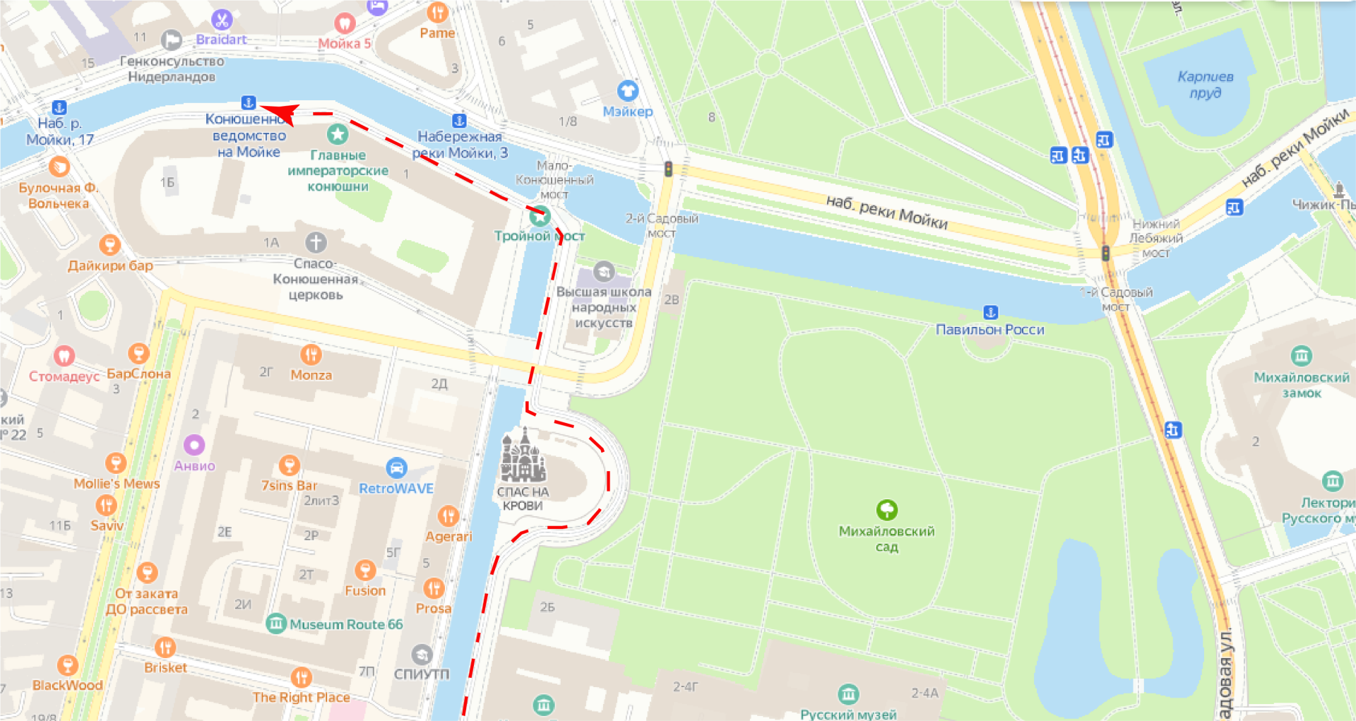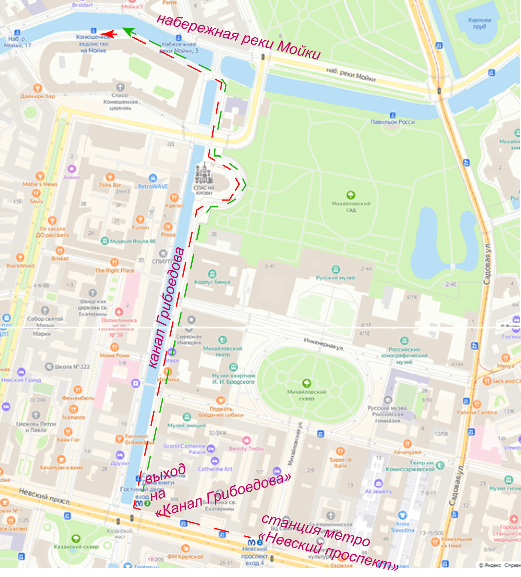 Место прибытия: наб. реки Мойки, 4 (причал "Конюшенное ведомство" у храма "Спас-на-крови")